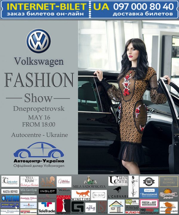 Volkswagen Fashion Show відбудеться 16 травня 2015, 18:00, субота в "Автоцентр-Украина". За допомогою сервісу internet-bilet.ua, Ви зможете з легкістю забронювати, замовити та купити квитки на концерт, спектакль, оперу, балет, майстер-класи, спортивні та дитячі заходи, що Вас цікавлять, оплативши їх найбільш зручним для Вас способом: через інтернет банківською карткою VISA/MasterCard, готівкою або кур'єром, якщо зробите замовлення квитка з доставкою.