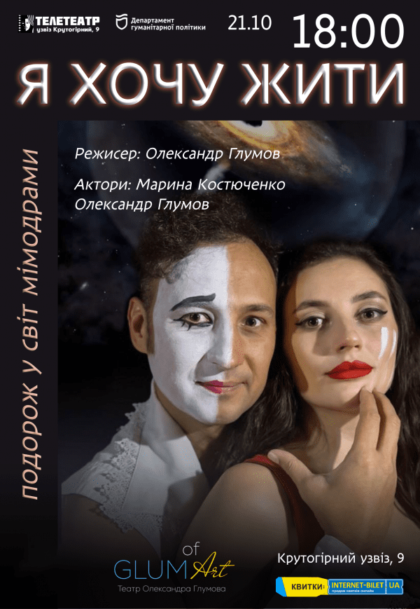 Жанр: мімодрама. 🎭 Приготуйтеся до надзвичайної подорожі у нашому новому шоу «Я хочу жити»! Це шоу, де слова стають зайвими, а мистецтво говорить мовою жесту. Під керівництвом головного режисера театру GlumArt та засновника театру Quasar Олександра Глумова, та його співзасновниці, чарівної актриси Марини Костюченко, ви пірнаєте у величезний світ мімодрами.